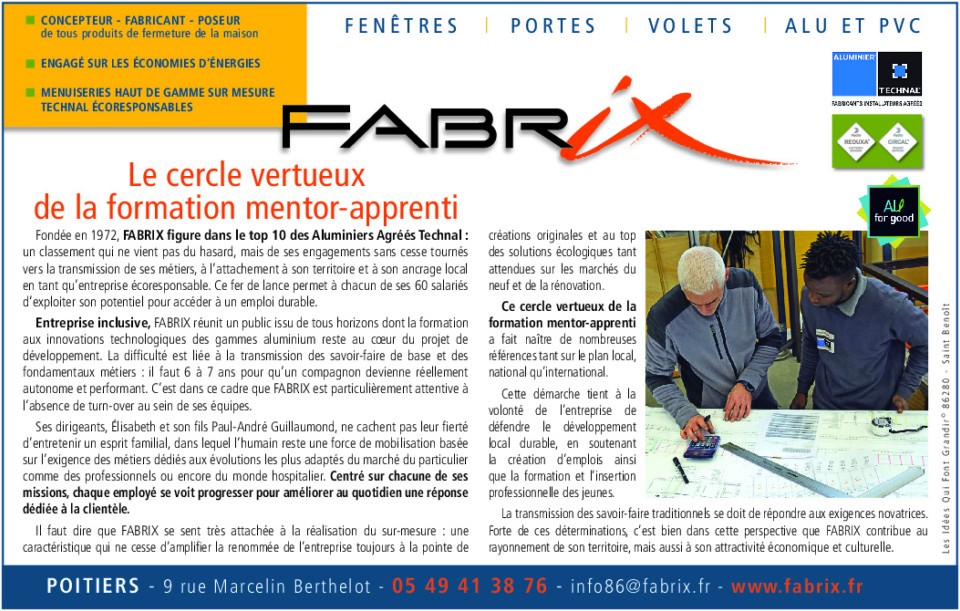 Fondée en 1972, FABRIX figure dans le top 10 des Aluminiers Agréés Technal : un classement qui ne vient pas du hasard, mais de ses engagements sans cesse tournés vers la transmission de ses métiers, à l’attachement à son territoire et à son ancrage local en tant qu’entreprise écoresponsable. Ce fer de lance permet à chacun de ses 60 salariés d’exploiter son potentiel pour accéder à un emploi durable.