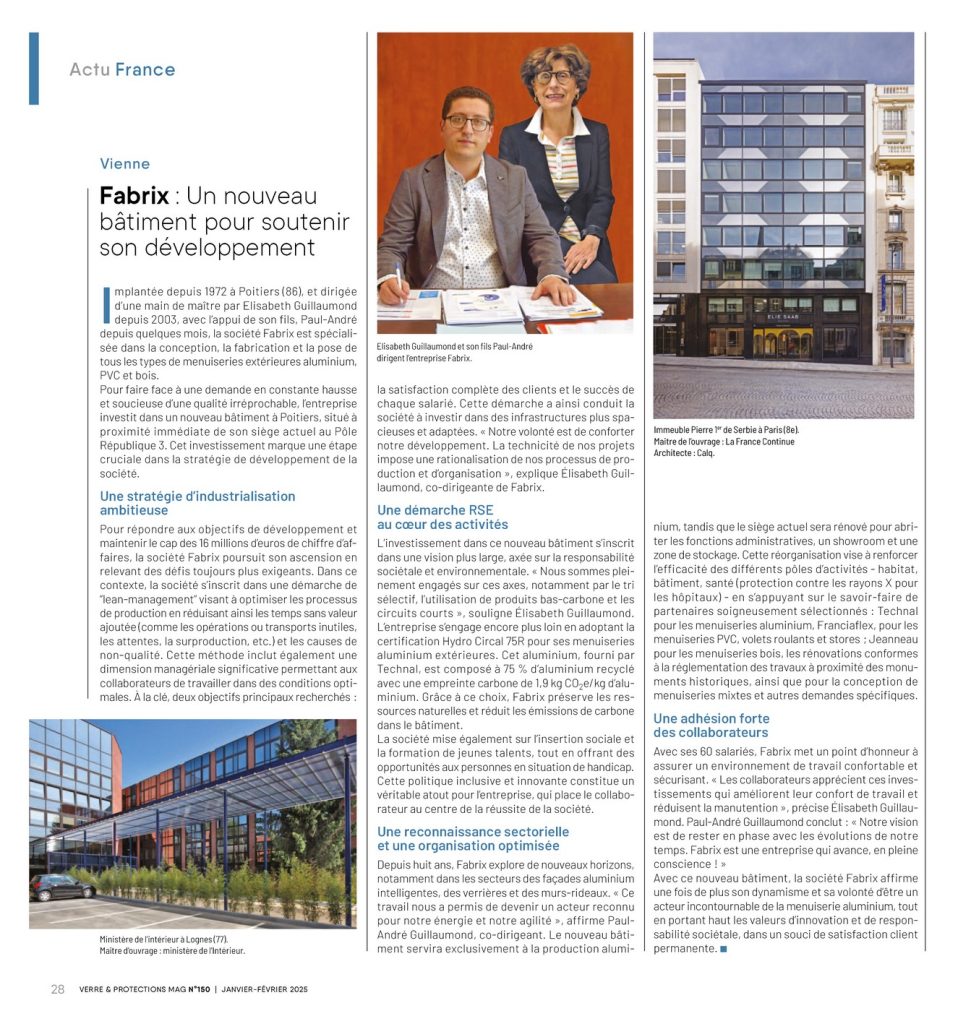 Pour accompagner sa croissance, Fabrix investit dans un nouveau bâtiment, un projet mis en lumière dans le Magazine Verre & Protection N°150.